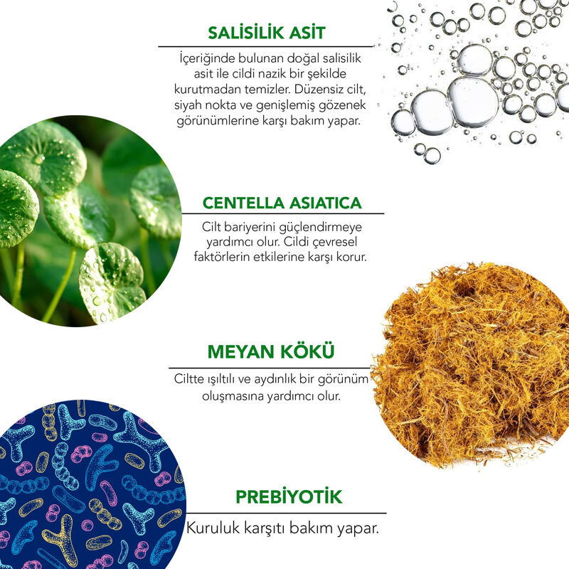 Aksöğüt ekstresi (bitkisel salisilik asit) ile cildi fazla sebumdan arındırarak gözeneklerin temizlenmesine ve cildin daha sıkı görünmesine yardımcı olur.