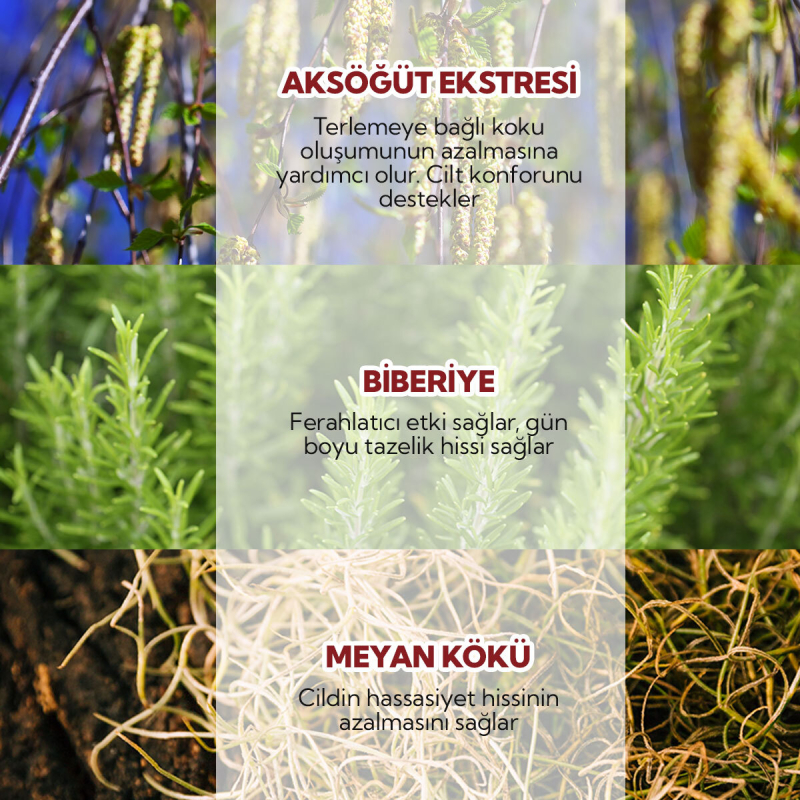 İçeriğindeki ak söğüt, biberiye, meyan kökü ve aslan pençesi ekstreleri ile koltuk altında kötü kokuya karşı bakım sağlar