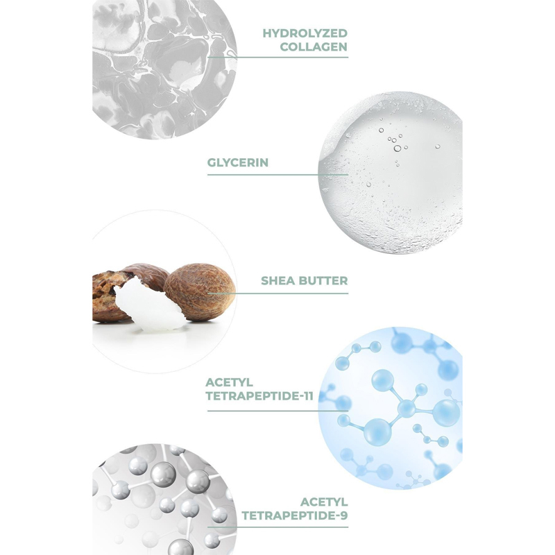 Aqua, Coco-Caprylate, Dicaprylyl Carbonate, Glyceryl Stearate, Butyrospermum Parkii (Shea) Butter, Glycerin, Ceteareth-20, Ceteareth-12, Cetearyl Alcohol, Hydrolyzed Collagen, Trehalose, Urea, Serine, Pentylene Glycol, Glyceryl Polyacrylate, Algin, Caprylyl Glycol, Sodium Hyaluronate, Pullulan, Disodium Phosphate, Potassium Phosphate, Sodium Stearoyl Glutamate, Sodium Polyacrylate, Phenoxyethanol, Parfum, Tocopheryl Acetate, Xanthan Gum, Ethylhexylglycerin.