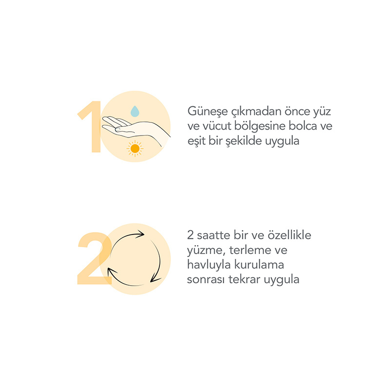 Güneşe çıkmadan önce yüz ve vücut bölgesine bolca ve eşit bir şekilde uygulayınız.