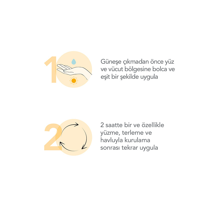 2 saatte bir ve özellikle yüzme ve havluyla kurulama sonrası tekrar uygulanmalıdır. Gözlere direkt temas ettirilmemelidir.