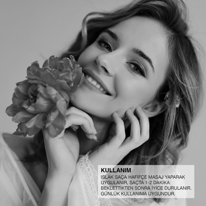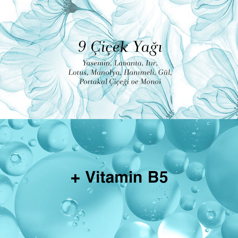 İçeriğindeki yasemin, lavanta, ıtır, lotus, manolya, hanımeli, gül, portakal çiçeği, monoi ve B5 vitamini ile kuru ve yıpranmış saçların ihtiyacı olduğu nemi geri kazandırarak sağlıklı bir görünüm sağlar.