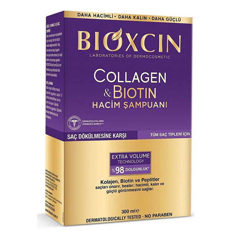 Bioxcin Collagen & Biotin Hacim Şampuanı; ince telli, hacimsiz ve güçsüz saçları içeriğindeki Hidrolize Kolajen, Biotin ve Bio-Active Peptitler ile dolgunlaştırır ve güçlendirir.