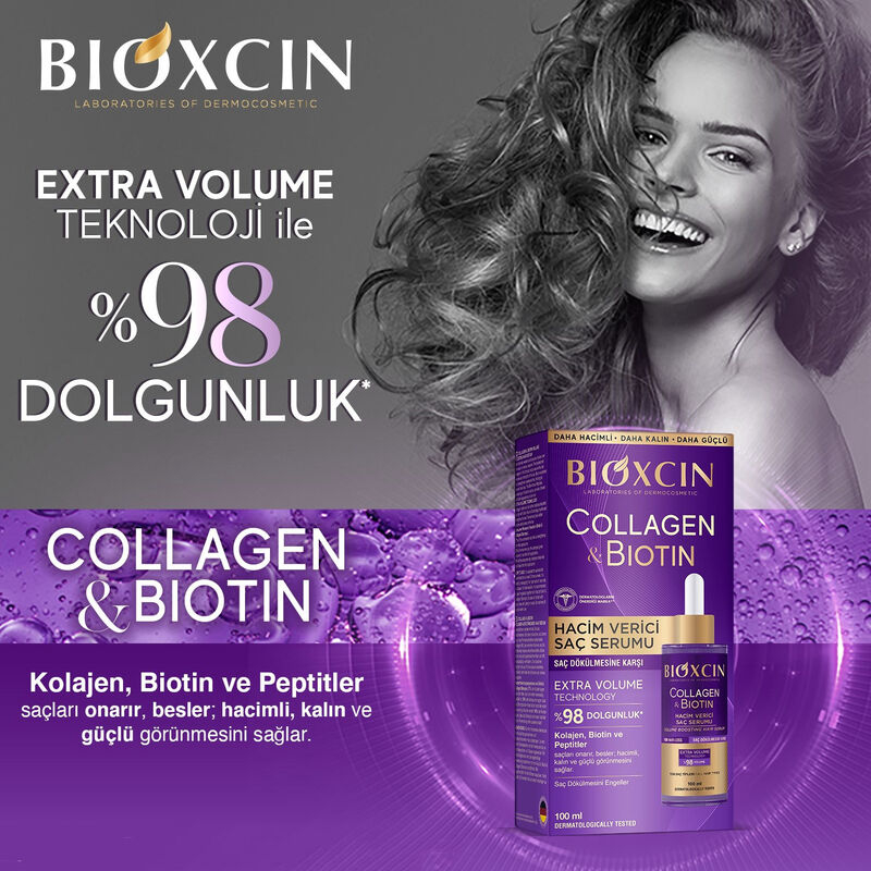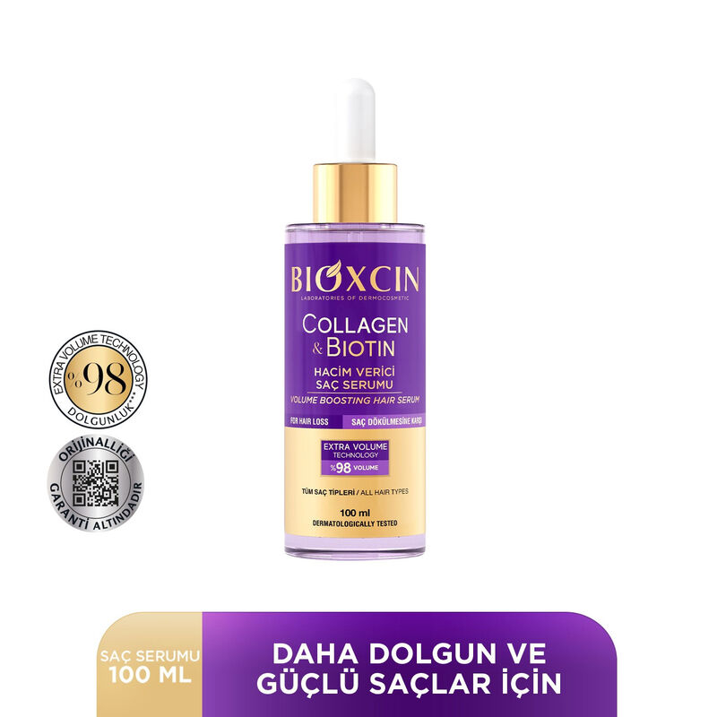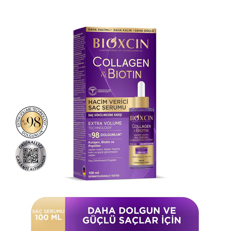 Bioxcin Collagen ve Biotin Hacim Verici Saç Serumu, ince telli, hacimsiz ve güçsüz saçları içeriğindeki hidrolize kolajen, biotin ve Bio-Activ Peptitler ile dolgunlaştırır ve güçlendirir. Patentli BioComplex B11 ile saç dökülmesine karşı bakım sağlar