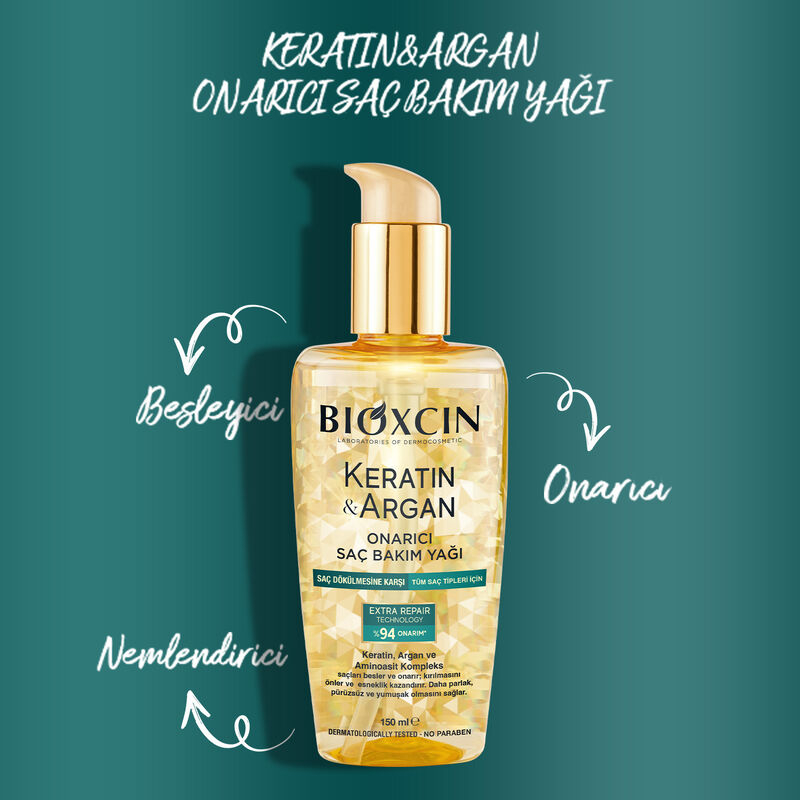 - Bioxcin Keratin & Argan Saç Bakım Yağı, canlılığını ve nemini kaybetmiş, yıpranma belirtileri gösteren saçlara özel olarak formüle edilmiştir. İçeriğinde yer alan hidrolize keratin ve argan yağı ile saç tellerini ağırlaştırmadan beslemeye ve saçın nem dengesini korumasına yardımcı olur.
