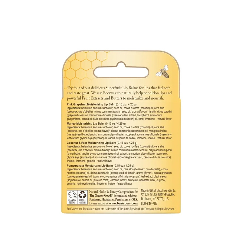 Bu 4'lü paket, dudakları her mevsimde nemli tutmak için taze meyveli dudak balmlarıyla doludur. Süper Meyveli Dudak Balmlarımız, dudakları doğal olarak beslemeye yardımcı olan balmumu ve harika lezzetler içerir; böylece dudaklar yumuşak ve lezzetli olur.