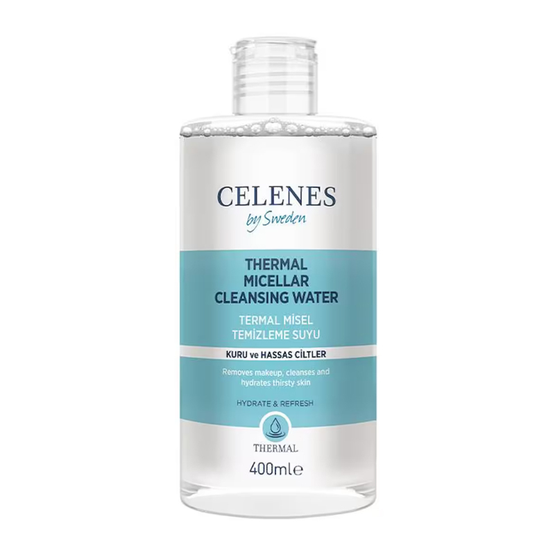 - Celenes by Sweden’in özel formülüyle geliştirilen Thermal Misel Temizleme Suyu, kuru ve hassas cilt tipleri için nazik ama etkili bir temizlik sunar.