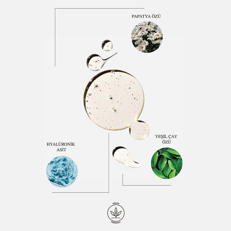 İçeriği papatya, Yeşil çay, Niasinamid, Panthenol ve Hyaluronic asit ile zenginleştirilmiştir. Cildinizi kirlerden nazikçe temizlemeye yardımcıdır.