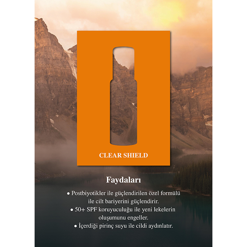 Clear Shield 50+ SPF Posbiotic Güneş Koruyucu, postbiyotik içeriklerle desteklenmiş gelişmiş bir cilt bakım ürünüdür. Cildi güneş ışınlarının zararlı etkilerine karşı korumaya destek olurken, aynı zamanda cilt görünümünü eşitlemeye yardımcı olan özel bileşenler içerir.Formül İçeriği ve Yapısı: