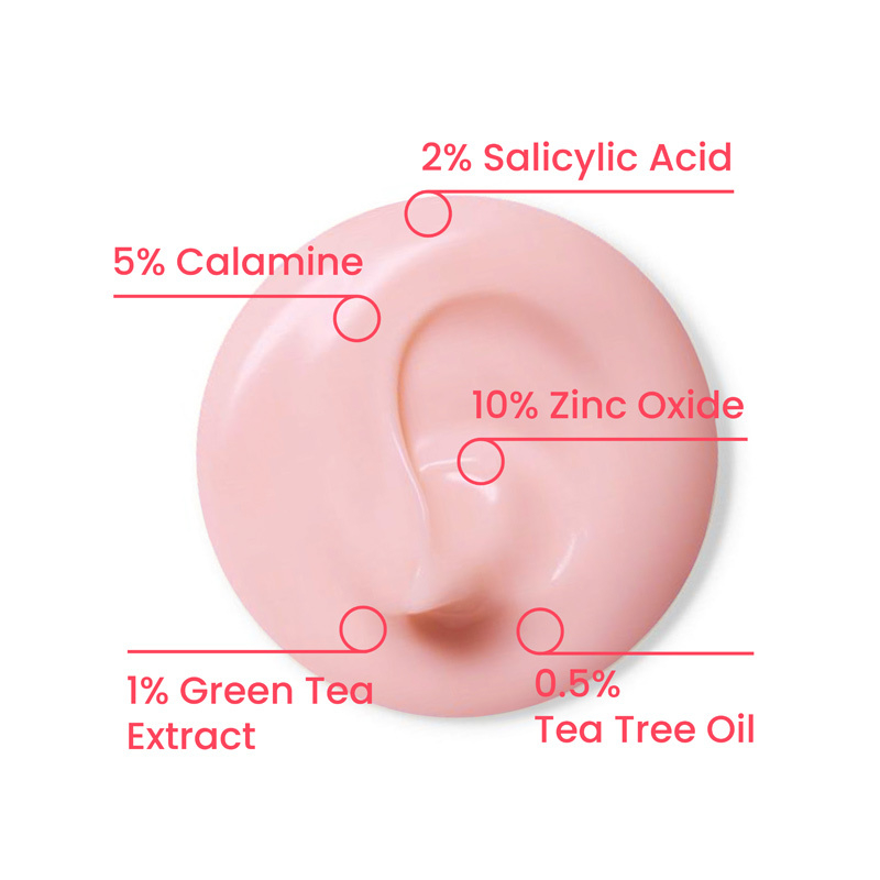 Isopropyl Alcohol, Aqua, Zinc Oxide, Calamine, Glycerin, Salicylic Acid, Zinc PCA, Melaleuca Alternifolia Leaf Oil, Allantoin, Sulfur, Camphor, Camellia Sinensis Leaf Extract, Phenoxyethanol, Ethylhexylglycerin, Potassium Sorbate, Sodium Benzoate.