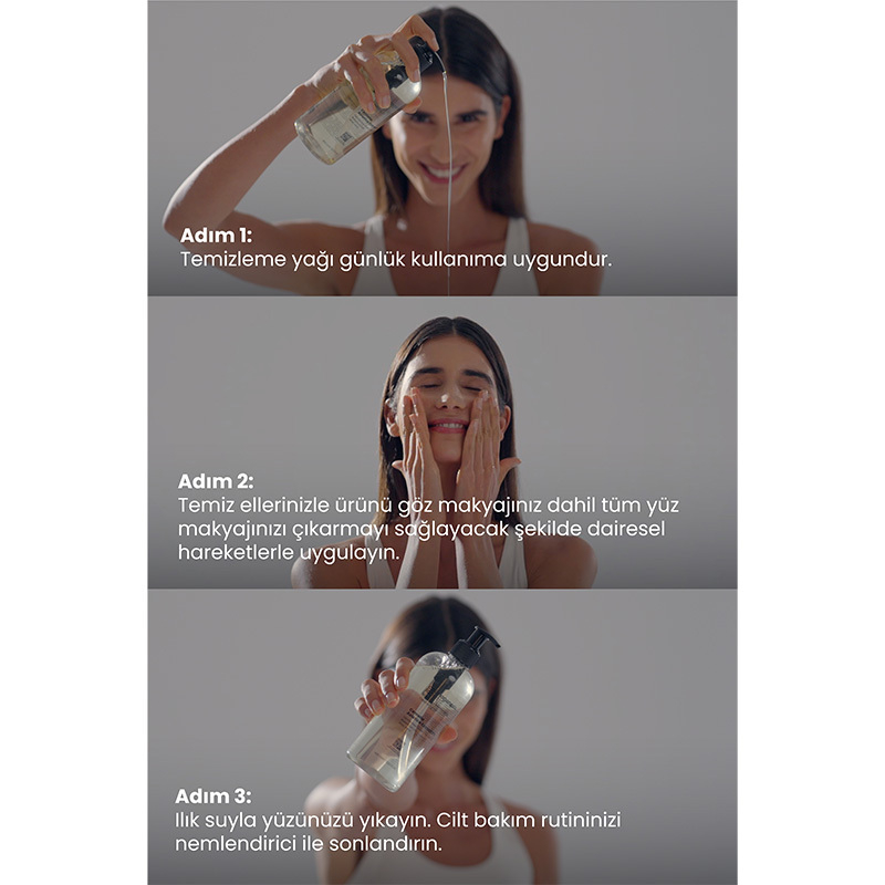 Sabah ve akşam ellerinizle veya bir temizleme pedi yardımıyla az miktarda temizleme yağını yüzünüze masaj yaparak uygulayınız.