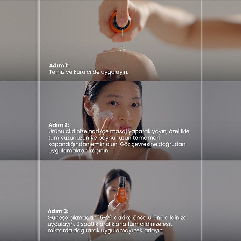 Güneşe çıkmadan 15-20 dakika önce ürünü cildinize uygulayınız.
