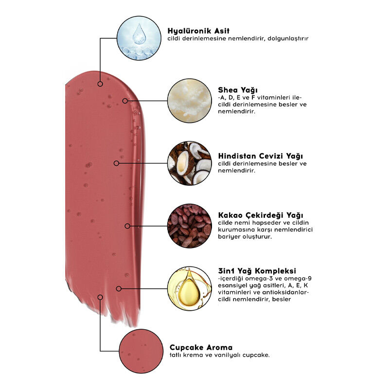 • Yoğun nemlendirme sağlar, besler, parlatır ve dudağa gül kurusu rengi verir.