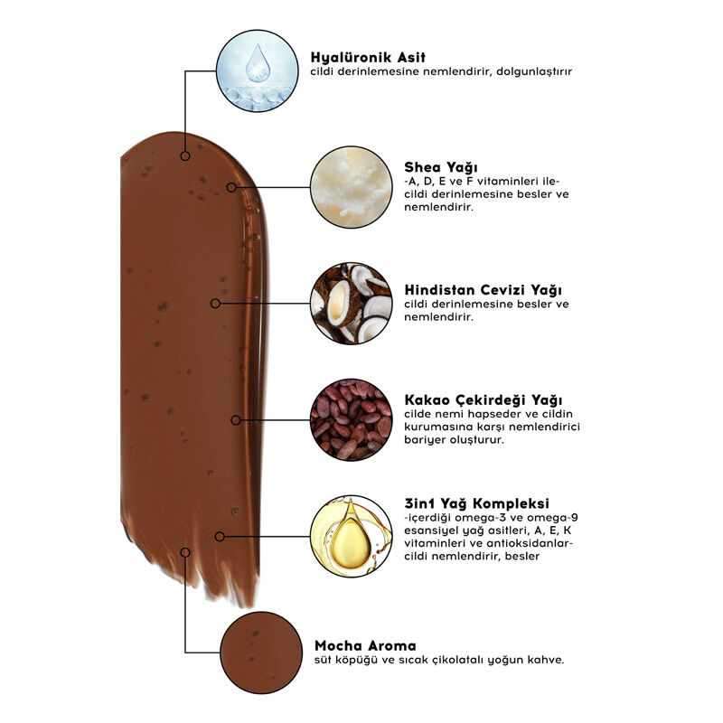 • Kakao Çekirdeği Yağı cilde nemi hapseder ve cildin kurumasına karşı nemlendirici bariyer oluşturmaya çalışır.