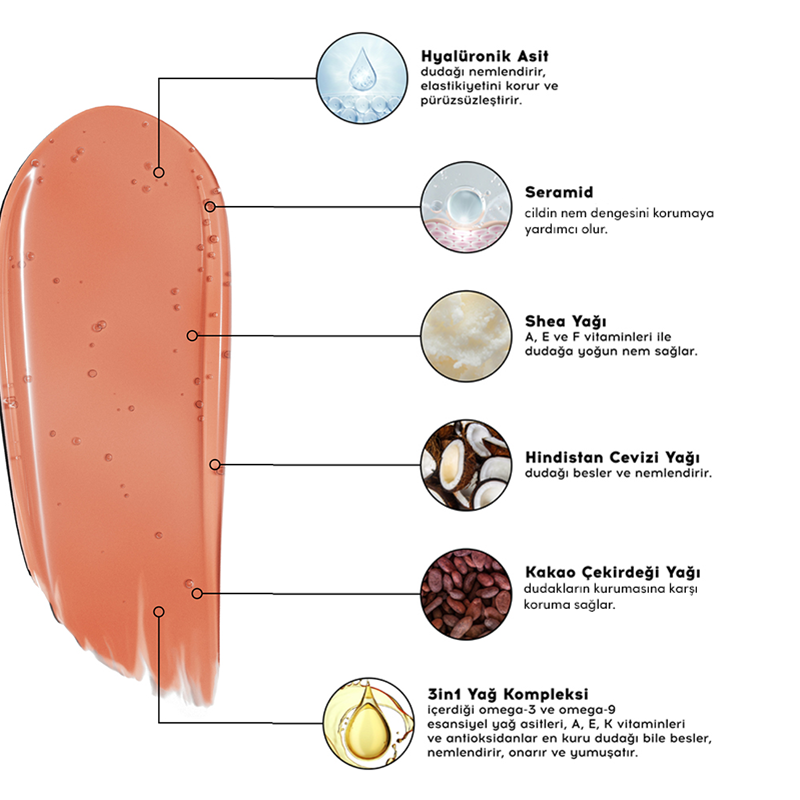 - 3in1 Yağ Kompleksi içerdiği omega-3 ve omega-9 esansiyel yağ asitleri, A, E, K vitaminleri ve antioksidanlar en kuru dudağı bile besler, nemlendirir ve yumuşatır.