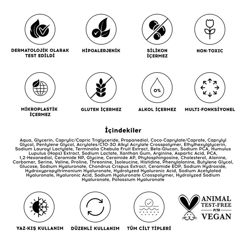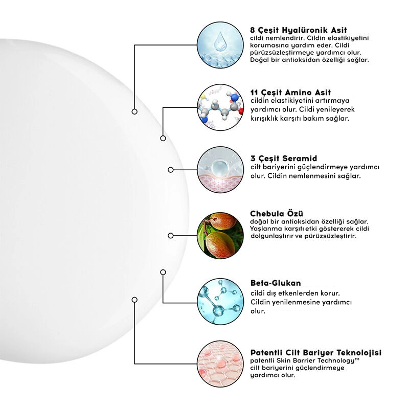 - 3 Çeşit Seramid cilt bariyerini güçlendirmeye yardımcı olur. Cildin nemlenmesini sağlar.