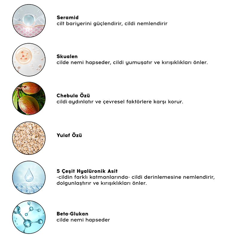 - Seramid cilt bariyerini güçlendirmeye yardımcı olur. Cildin nemlenmesini sağlar. Skualen cilt elastikiyetini arttırmaya yardımcı olur. Cildi nemlendirir ve cildin daha aydınlık ve ışıltılı görünmesini destekler.