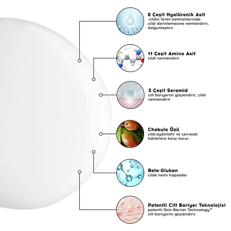 - 3 Çeşit Seramid cilt bariyerini güçlendirmeye yardımcı olur. Cildin nemlenmesini sağlar.