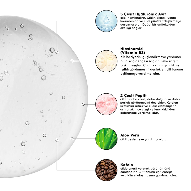 - Beş çeşit hyalüronik asit ile nemlendirir, peptitler ile kolajen üretimini destekler, niasinamid ile yağ dengesi sağlar ve kafein ile canlandırır.
