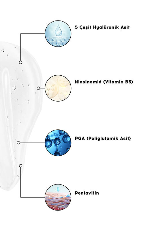 5 çeşit hyalüronik asit, poliglutamik asit ve pentavitin ile cildi nemlendirir ve nemi hapseder.