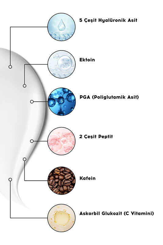 5 Çeşit Hyalüronik Asit -cildin farklı katmanlarında- cildi derinlemesine nemlendirir, dolgunlaştırır ve kırışıklıklara karşı bakım sağlar.