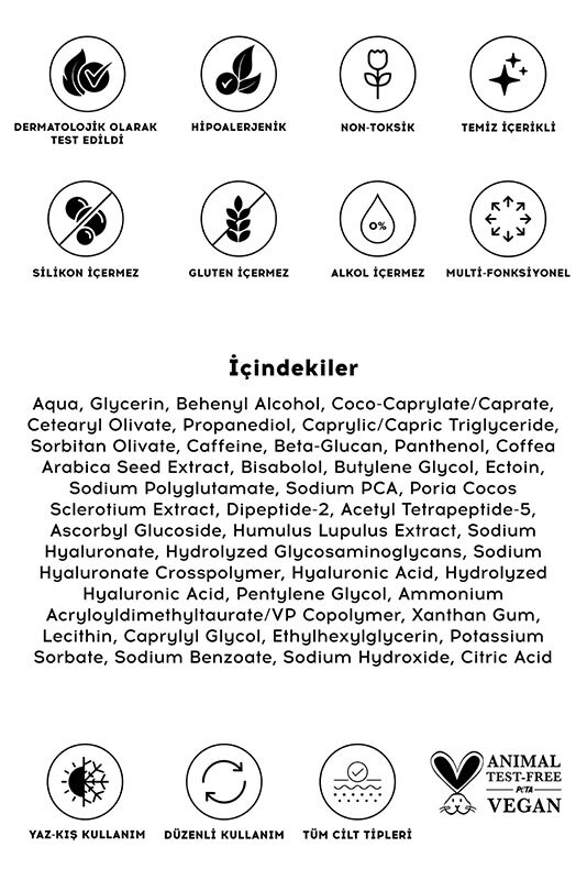 Aqua, Glycerin, Behenyl Alcohol, Coco-Caprylate/Caprate, Cetearyl Olivate, Propanediol, Caprylic/Capric Triglyceride, Sorbitan Olivate, Caffeine, Beta-Glucan, Panthenol, Coffea Arabica Seed Extract, Bisabolol, Butylene Glycol, Ectoin, Sodium Polyglutamate, Sodium PCA, Poria Cocos Sclerotium Extract, Dipeptide-2, Acetyl Tetrapeptide-5, Ascorbyl Glucoside, Humulus Lupulus Extract, Sodium Hyaluronate, Hydrolyzed Glycosaminoglycans, Sodium Hyaluronate Crosspolymer, Hyaluronic Acid, Hydrolyzed Hyaluronic Acid, Pentylene Glycol, Ammonium Acryloyldimethyltaurate/VP Copolymer, Xanthan Gum, Lecithin, Caprylyl Glycol, Ethylhexylglycerin, Potassium Sorbate, Sodium Benzoate, Sodium Hydroxide, Citric Acid