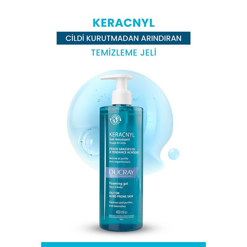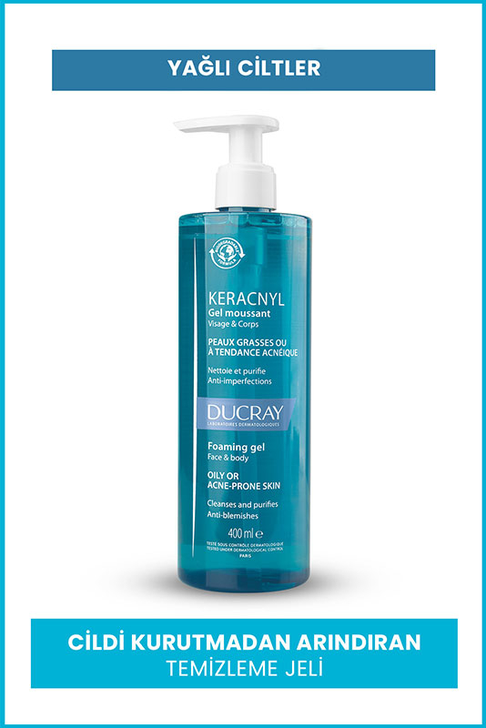 Ducray Keracnyl Jel Yağlı ciltler için temizleme Jeli, sabah ve akşam olmak üzere günlük kullanıma uygundur.