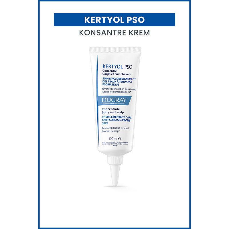 Ducray Kertyol PSO Konsantre Krem, vücuttaki kuru (dirsekler, dizler, kaval kemiği bölgesi, vb.) ya da saç derisine doğrudan uygulama için tamamlayıcı bakım olarak geliştirilmiştir.