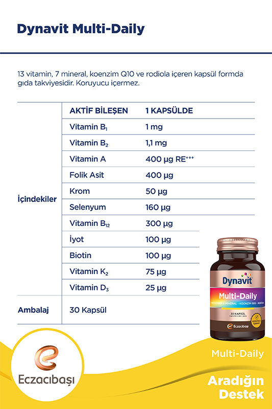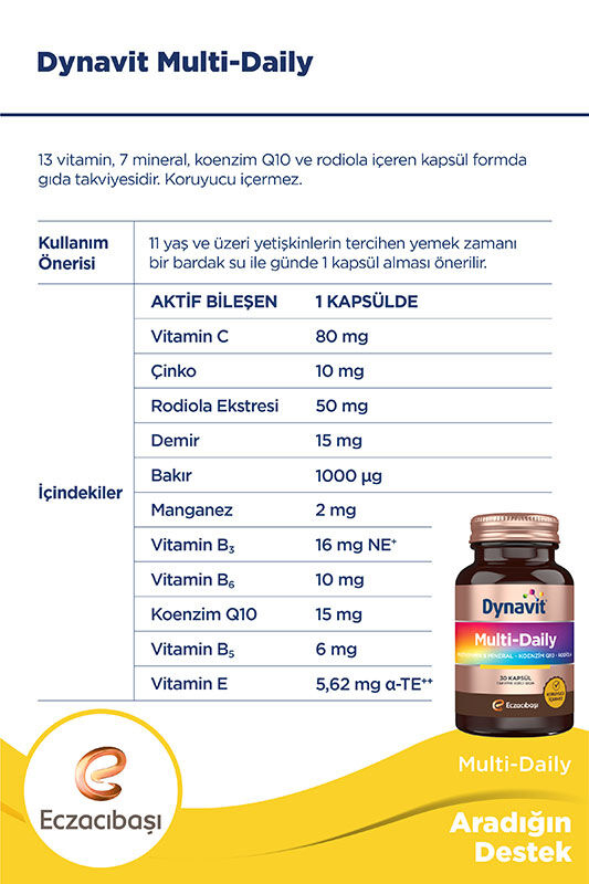 Multivitamin, Mineral, Koenzim Q10, Rodiola Ekstresi içeren takviye edici gıda.