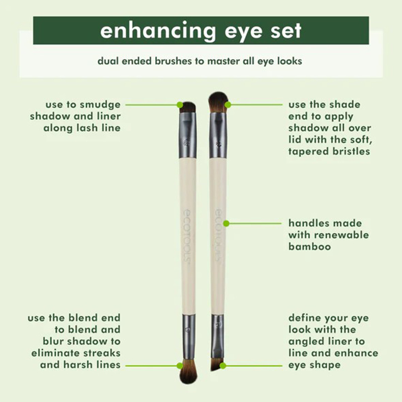 EcoTools Eye Enhancing Duo Set, makyaj çantanızda yer tasarrufu sağlamak ve uygulama pratikliğini artırmak amacıyla tasarlanmış yenilikçi bir fırça setidir. Çift taraflı özel tasarımı sayesinde, sadece 2 fırça gövdesinde göz makyajının tüm aşamaları için gerekli olan 4 farklı fırça başlığını bir arada sunar. Sürdürülebilir bambu sapları, geri dönüştürülmüş alüminyum bilezikleri ve vegan kılları ile hem doğaya duyarlı hem de yüksek performanslı bir makyaj deneyimi sağlamayı hedefler.Kullanım Şekli: