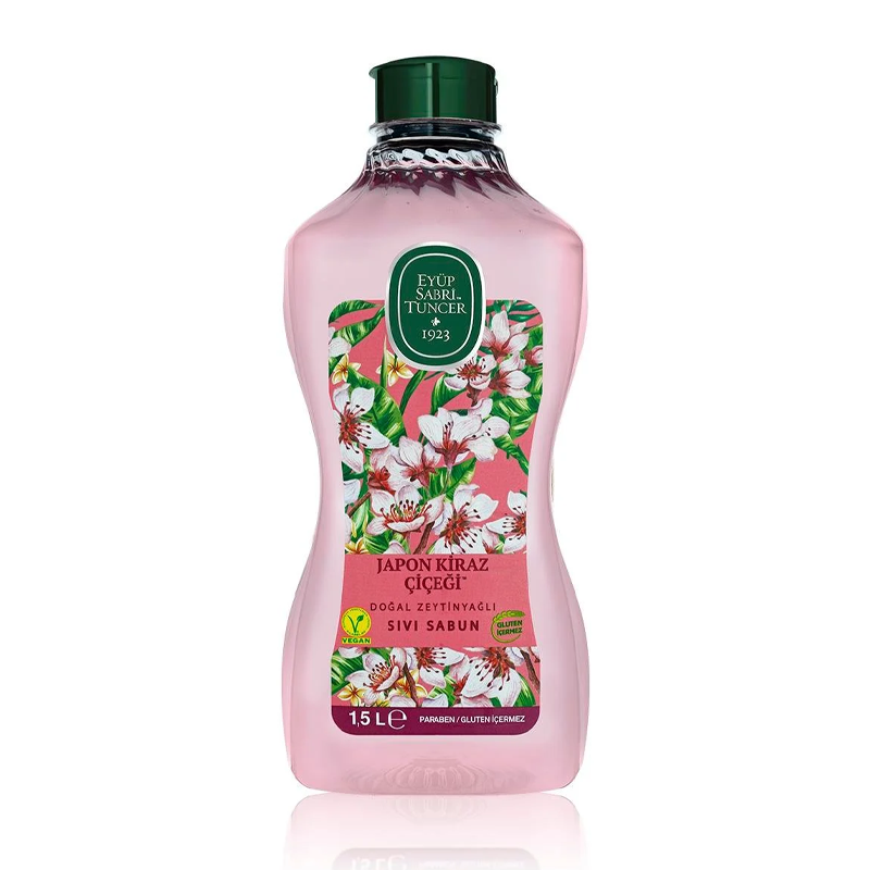 - %100 Doğal zeytinyağı içeren Eyüp Sabri Tuncer Japon Kiraz Çiçeği Doğal Zeytinyağlı Sıvı Sabun 1.5 lt, kusursuz bir güzellik için başta el ve yüz olmak üzere vücudun günlük temizliğinde kullanılır.