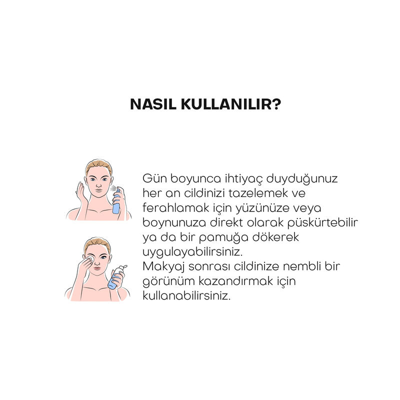Gün boyunca ihtiyaç duyduğunuz her an cildinizi tazelemek için direkt olarak yüzünüze ve boynunuza püskürtebilir veya pamuğa dökerek uygulayabilirsiniz.