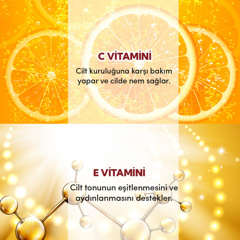 Antioksidanlar ile zenginleştirilmiş formülü C ve E vitaminleri sayesinde cildin aydınlanmasına ve doğal ışıltısının artmasına yardımcı olur.