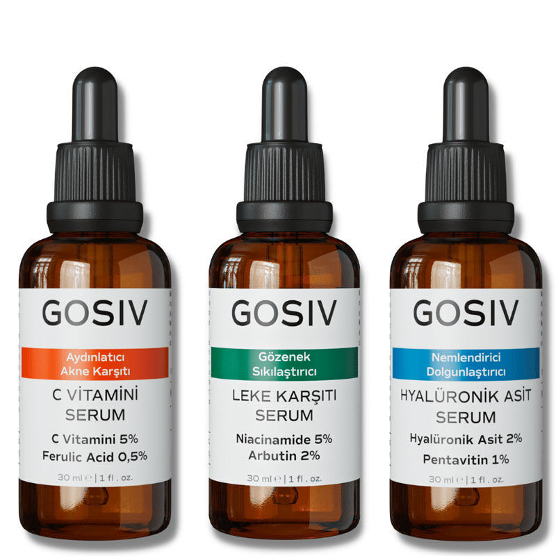 Gosiv Aydınlatıcı ve Düzensiz Ciltler İçin C Vitamini Serum 30 ml - Gosiv Gözenek Sıkılaştırıcı ve Leke Karşıtı Cilt Bakım Serumu 30 ml - Gosiv Nemlendirici ve Dolgunlaştırıcı Hyalüronik Asit Serum 30 ml