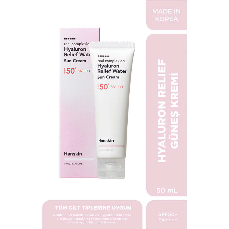 Hanskin Hyaluron Relief Water Sun Cream, SPF 50 ve PA++++ koruma seviyeleriyle, cildinizi güneşin zararlı UVB ve UVA ışınlarından etkin bir şekilde korur.