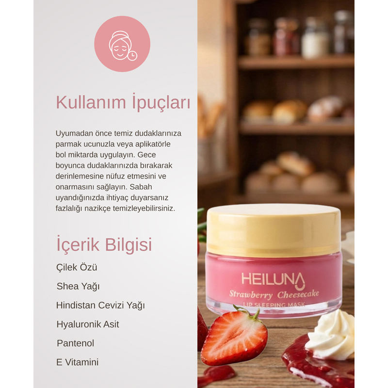 Heiluna Strawberry Cheesecake Lip Sleeping Mask; çilekli cheesecake dokunuşundan ilham alan, dudaklara parlak bir nem etkisi ve aydınlık bir görünüm sunmayı hedefleyen yoğun destekli bir dudak bakım maskesidir. Zengin formülü sayesinde dudakların daha canlı görünmesine, yumuşamasına ve doğal dolgunluğunun artmasına yardımcı olur.