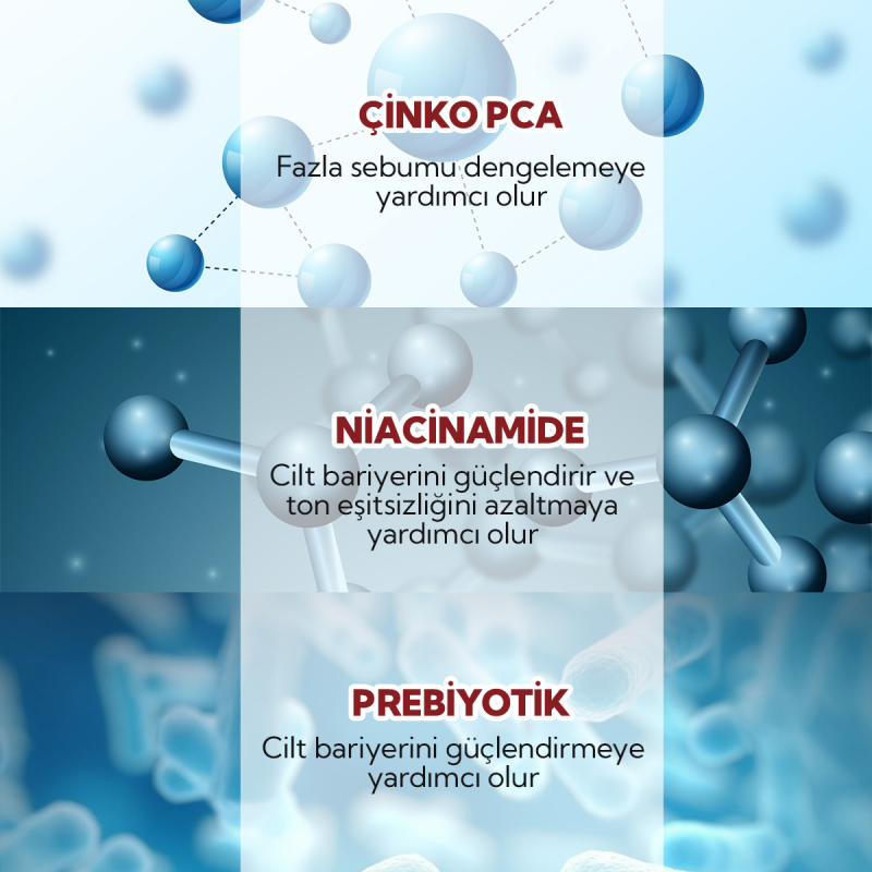 Çinko PCA, saccharide isomerate ve Sodium PCA gibi bileşenlerle cildin doğal nemini korur; inulin (prebiyotik) ile cilt florasını destekleyerek bariyer fonksiyonlarını güçlendirir.
