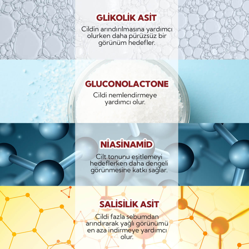 İçeriğindeki glikolik asit, niasinamid ve meyan kökü ekstresi ile cilt tonunu eşitlemeye yardımcı olur.