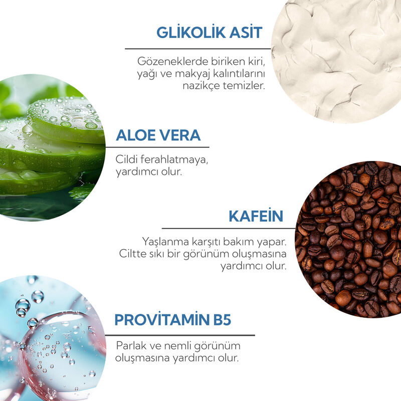 - İçeriğinde bulunan %5 oranında Glikolik Asit sayesinde gözeneklerinizi ve yüzünüzü etkili bir şekilde temizlerken aynı zamanda gözenek görünümüne karşı bakım yapmaya yardımcı olur.