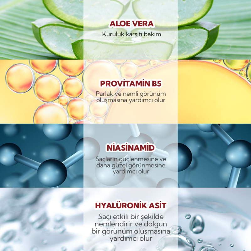 Niacinamide ve Provitamin B5 (Panthenol) gibi aktiflerle saç tellerini güçlendirir, saçın elastikiyetini artırır ve kırılmaları önlemeye yardımcı olur.