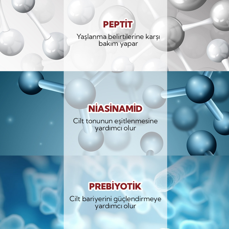 Peptitler ve aminoasitlerle yaşlanma belirtilerine karşıtı bakım sağlar.