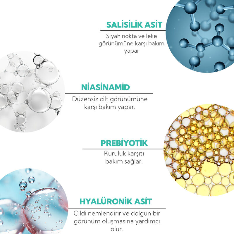 - İçeriğindeki niasinamid, çinko PCA ve çinko glukonat ile ciltteki gözenekleri küçültmeyi, cilt tonu eşitsizliklerini dengelemeyi hedefler.