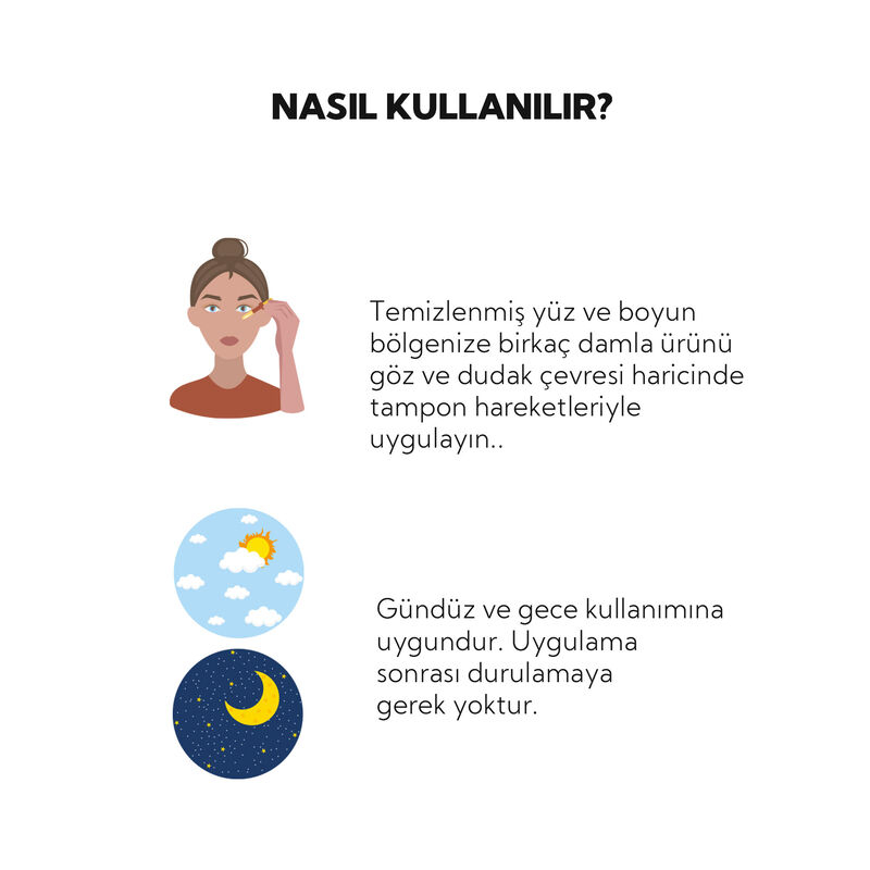 - Temizlenmiş yüz ve boyun bölgenize birkaç damla ürünü göz ve dudak çevresi haricinde tampon hareketleriyle uygulayın.