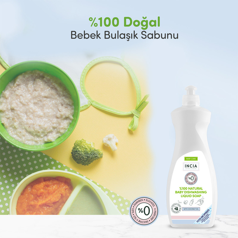 Incia Doğal Bebek Bulaşık Sabunu SLES/SLS, silikon, sentetik koku, sentetik boya, mineral yağ içermez.