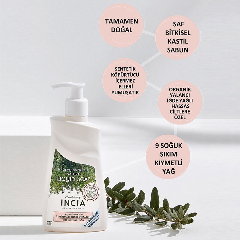Tamamen doğal bitkilerden elde edilen yağlarla ve patent korumalı buluşlarımızla üretilen INCIA Hassas Ciltler İçin Zeytinyağlı Doğal Sıvı Sabun ellerinizi cildinizin doğal florasına zarar vermeden temizlemeye yardımcıdır.