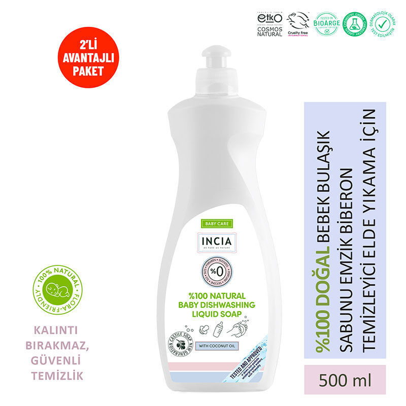 Incia Doğal Bebek Bulaşık Sabunu SLES/SLS, silikon, sentetik koku, sentetik boya, mineral yağ içermez.
