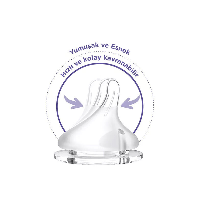 Ekstra yumuşak, esnek silikon; bebeğin damağına adapte olur ve dalgaya benzer dil hareketini emzik üzerinde uygulamasını destekler.