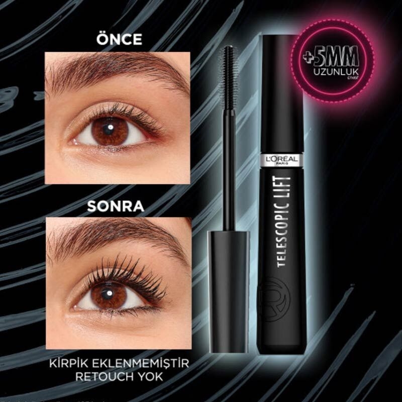 L'Oréal Paris'ten Siyah Teleskopik Kaldırma Maskarası ile kirpikleriniz +5 mm'ye kadar daha uzun kirpikler ile kaldırma etkisine kavuşur.