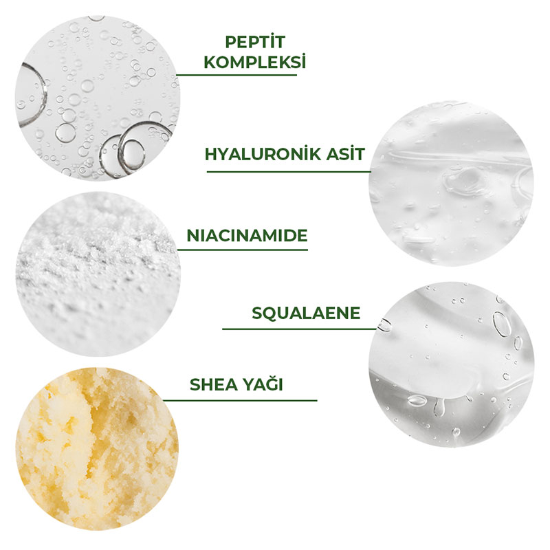 Peptit Kompleksi: Güçlü peptit karışımı, ince çizgilerin ve kırışıklıkların görünümünü azaltmaya yardımcı olur, cildinize daha canlı ve parlak bir görünüm kazandırır.