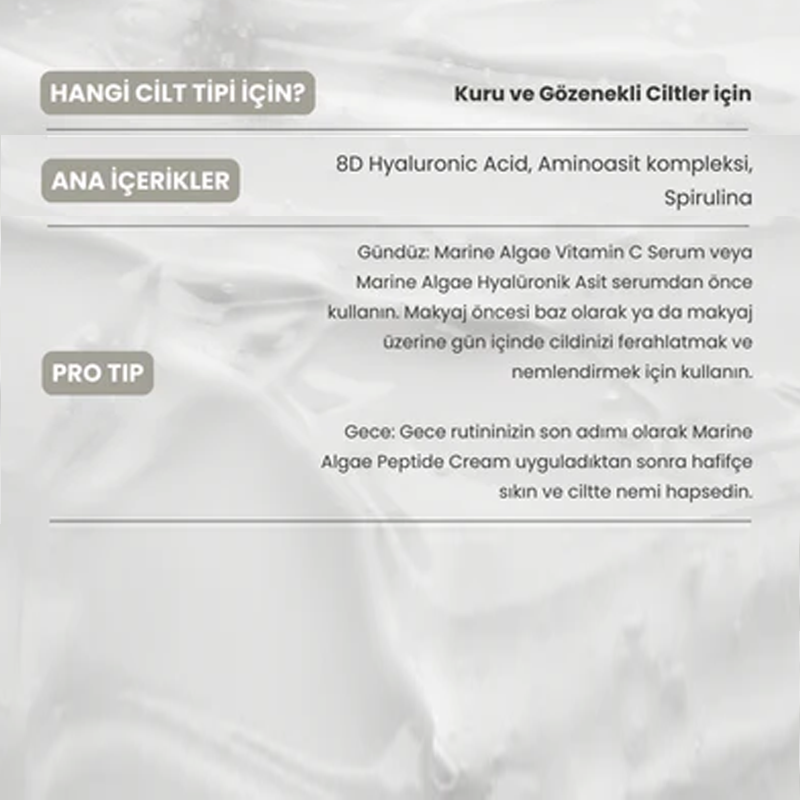 Marine Algae Yüz Misti, cildinizi anında ferahlatır ve nemlendirir. Deniz yosunu özü ve 8 çeşit Hyaluronik Asit ile zenginleştirilmiş bu mist, cildinizi nemlendirirken tazelik hissi kazandırır.
